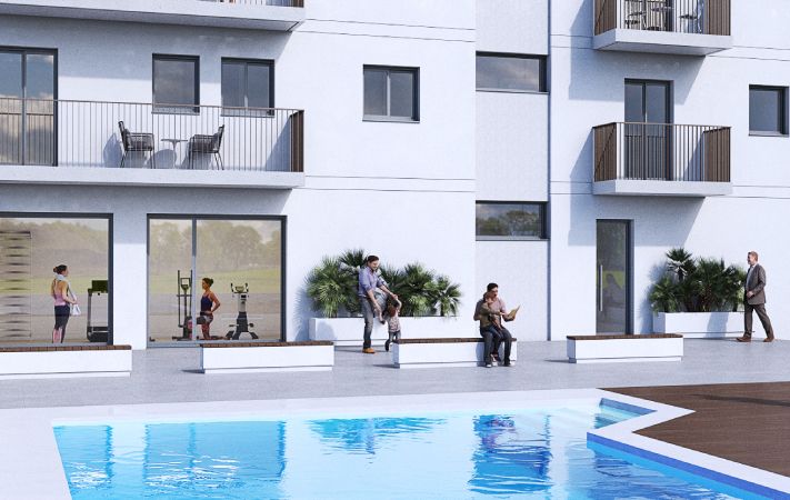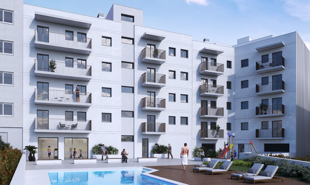 Conjunto de 28 viviendas de 1, 3 y 4 dormitorios exteriores con zona comunitaria, piscina, zona de juegos infantil y gimnasio totalmente equipado, todo ello, dentro de un recinto cerrado de acceso privado, con plazas de parking y trasteros en el sótano.