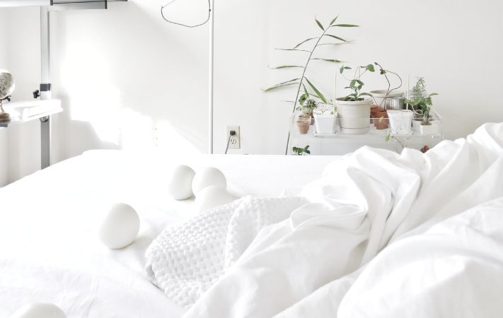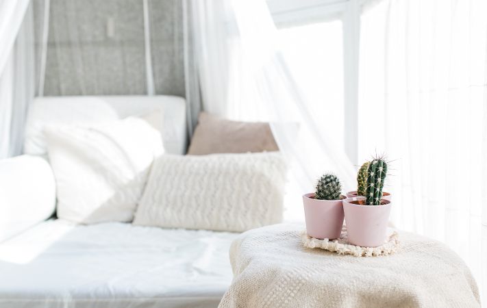 Si no deseas sumergirte por completo con el color blanco, puedes minimizar su efecto añadiendo pequeños toques en tonalidades distintas como pueden ser los complementos textiles que proporcionan calidez y contraste. Sin duda, cualquier nota de color en un espacio blanco será muy protagonista, así que decide qué prefieres destacar: cojines, alfombras, mantas, cortinas, etc.